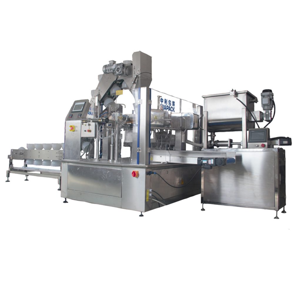 Bu mashina qattiq mahsulotlar bilan aralashtirilgan suyuq mahsulotni to'ldirish, sho'rva bilan tuzlangan bodring, tuzlangan zaytun, tuzlangan bodring va boshqalar kabi oziq-ovqatlarni oldindan pishirish uchun mo'ljallangan. Qattiq mahsulotni oldindan tayyorlangan sumkaga solib, keyin pistonli nasos bilan to'ldirish uchun kosa lifti bilan. sous.