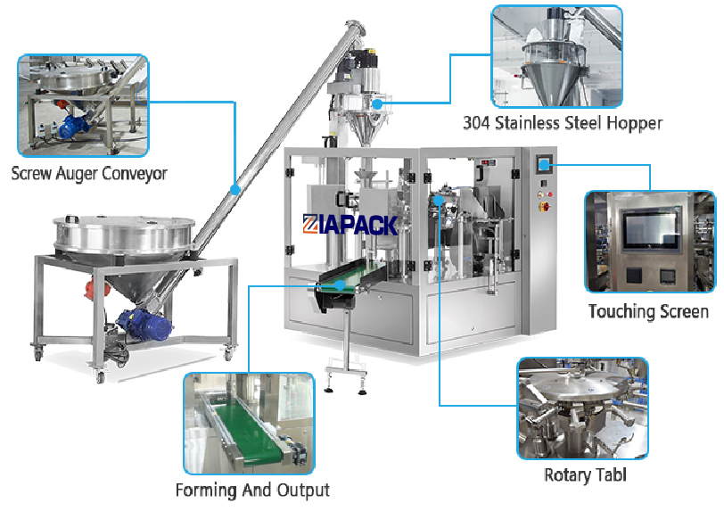 Ushbu mashina sumkani avtomatik ravishda olib, sumkani ochishi, materialni to'ldirishi va sumkani muhrlashi mumkin. Turli xil kukunli materiallarni qadoqlash uchun keng qo'llaniladi.