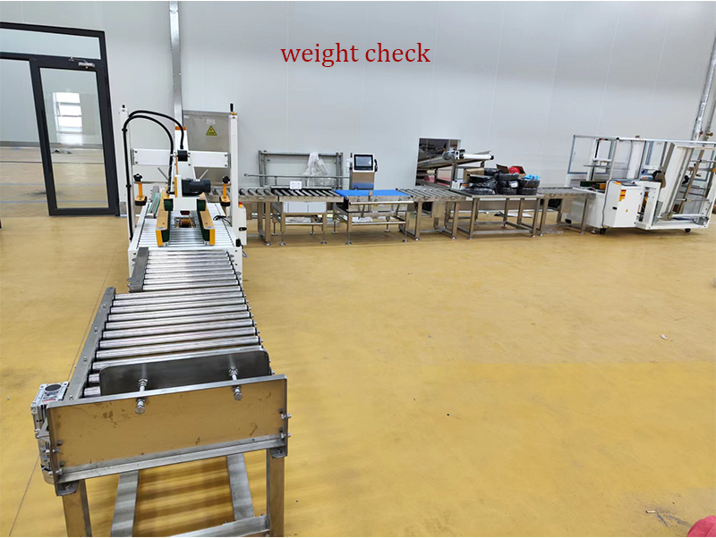 Qoplarni muzlatilgan oziq-ovqat bilan to'ldirgandan so'ng, har bir sumka og'irlikning maqsadli vaznga mos kelishini ta'minlash uchun og'irlik detektori tomonidan qayta tekshiriladi, so'ngra har bir qopga metall aralashmasligini ta'minlash uchun metall detektordan o'tadi. Keyin sumkalar karton to'ldirish liniyasiga o'tkaziladi.